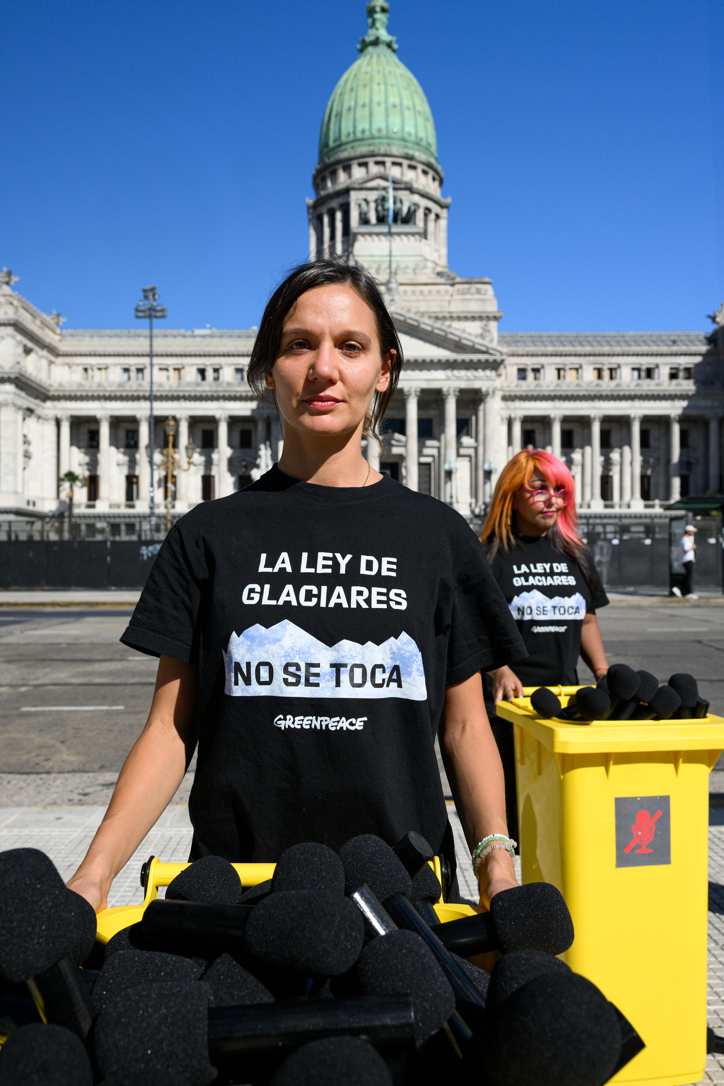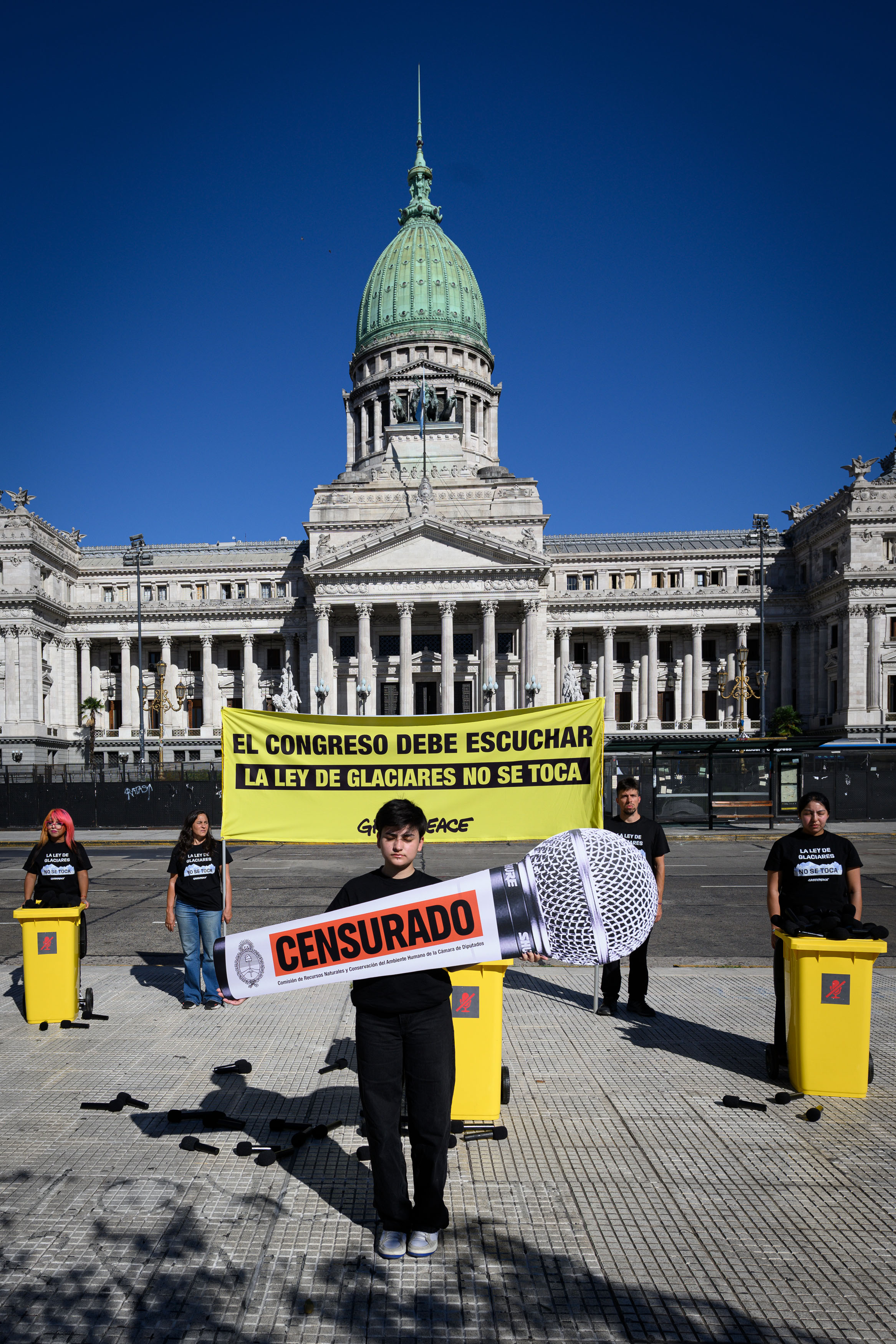 Greenpeace denuncia la limitación de participantes en la audiencia pública por la modificación de la Ley de GlaciaresLa organización llevó al Congreso micrófonos en tachos de basura con el mensaje “El Congreso debe escuchar. La Ley de Glaciares no se toca” para denunciar que la sociedad civil no es escuchada y que esta audiencia pública no representa una participación real. © Martin Katz / Greenpeace