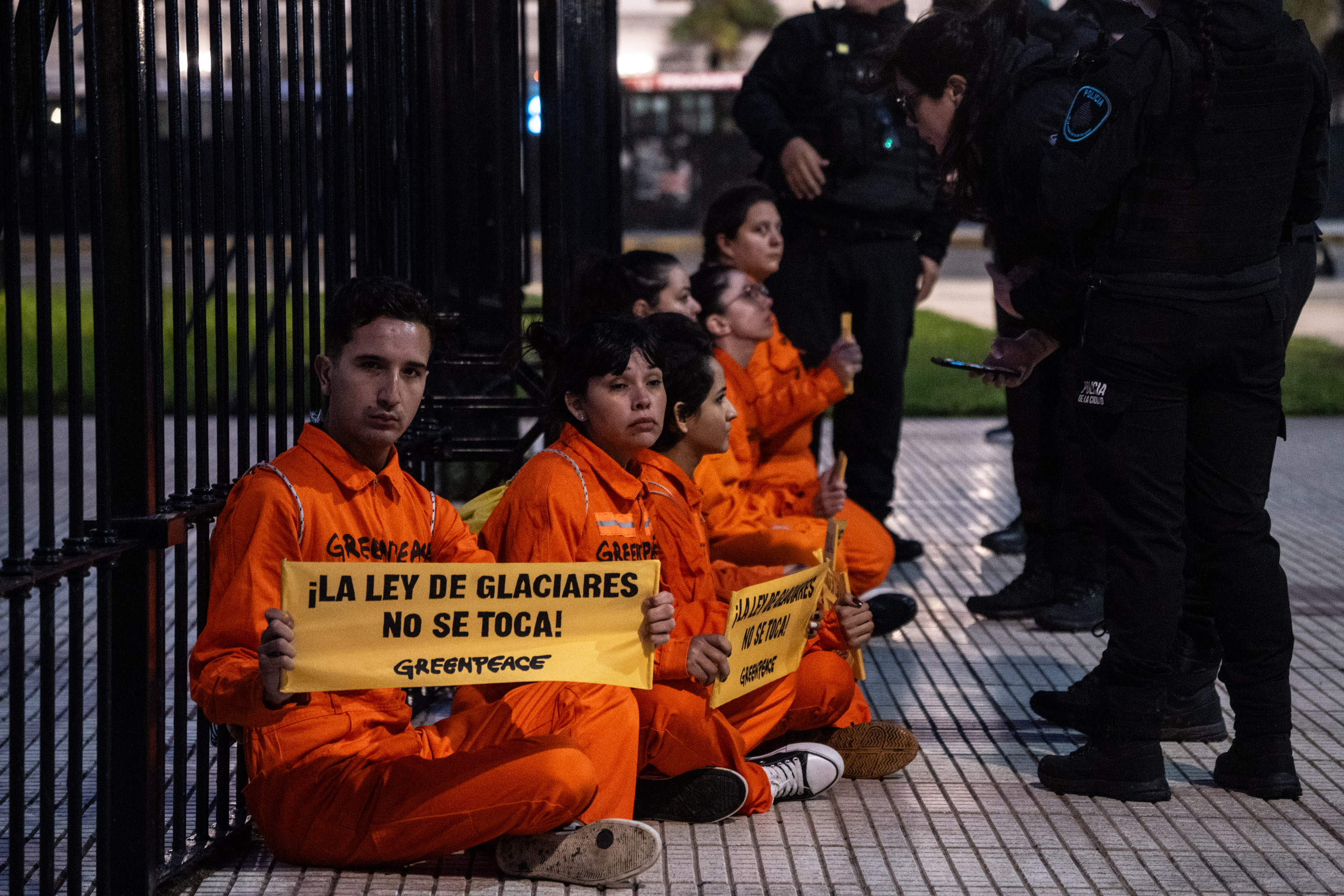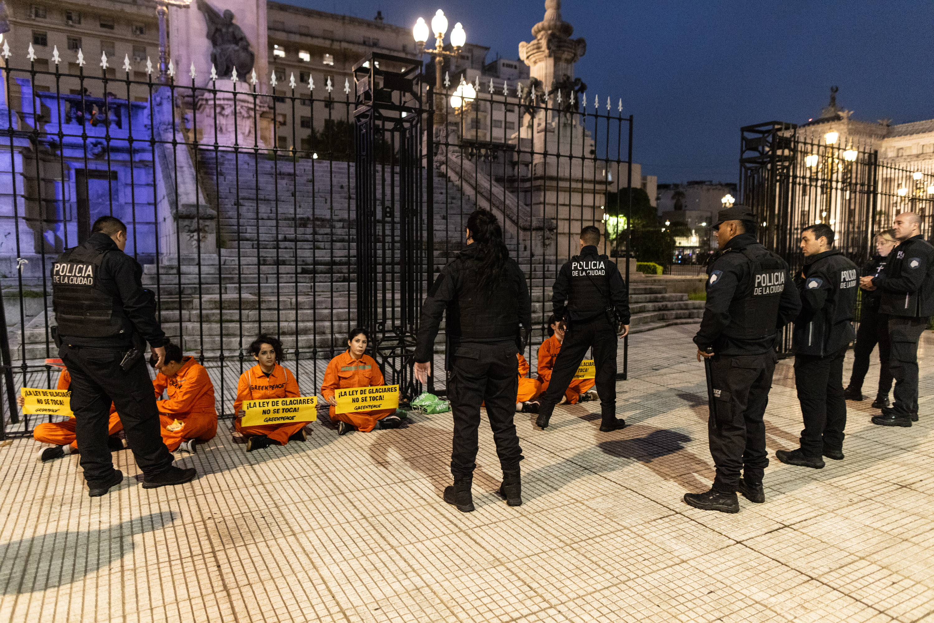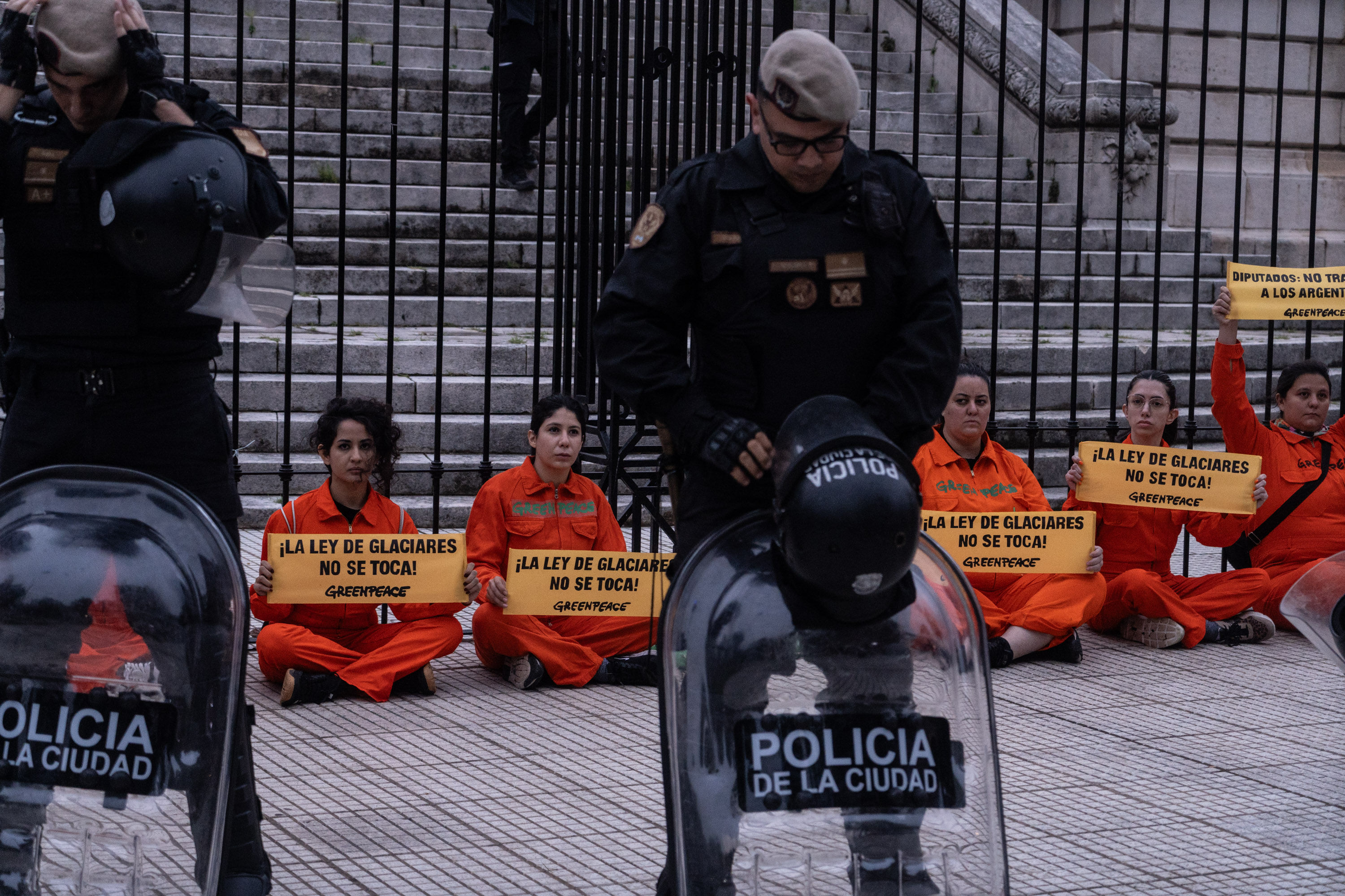 En la antesala del debate en la Cámara de Diputados sobre la modificación de la Ley de Glaciares, activistas de Greenpeace fueron detenidos hoy tras realizar una acción pacífica a metros del Congreso de la Nación para exigir a los legisladores que no avancen con el proyecto de reforma de la Ley que pone en riesgo las principales reservas de agua dulce del país © Sebastián Pani Greenpeace