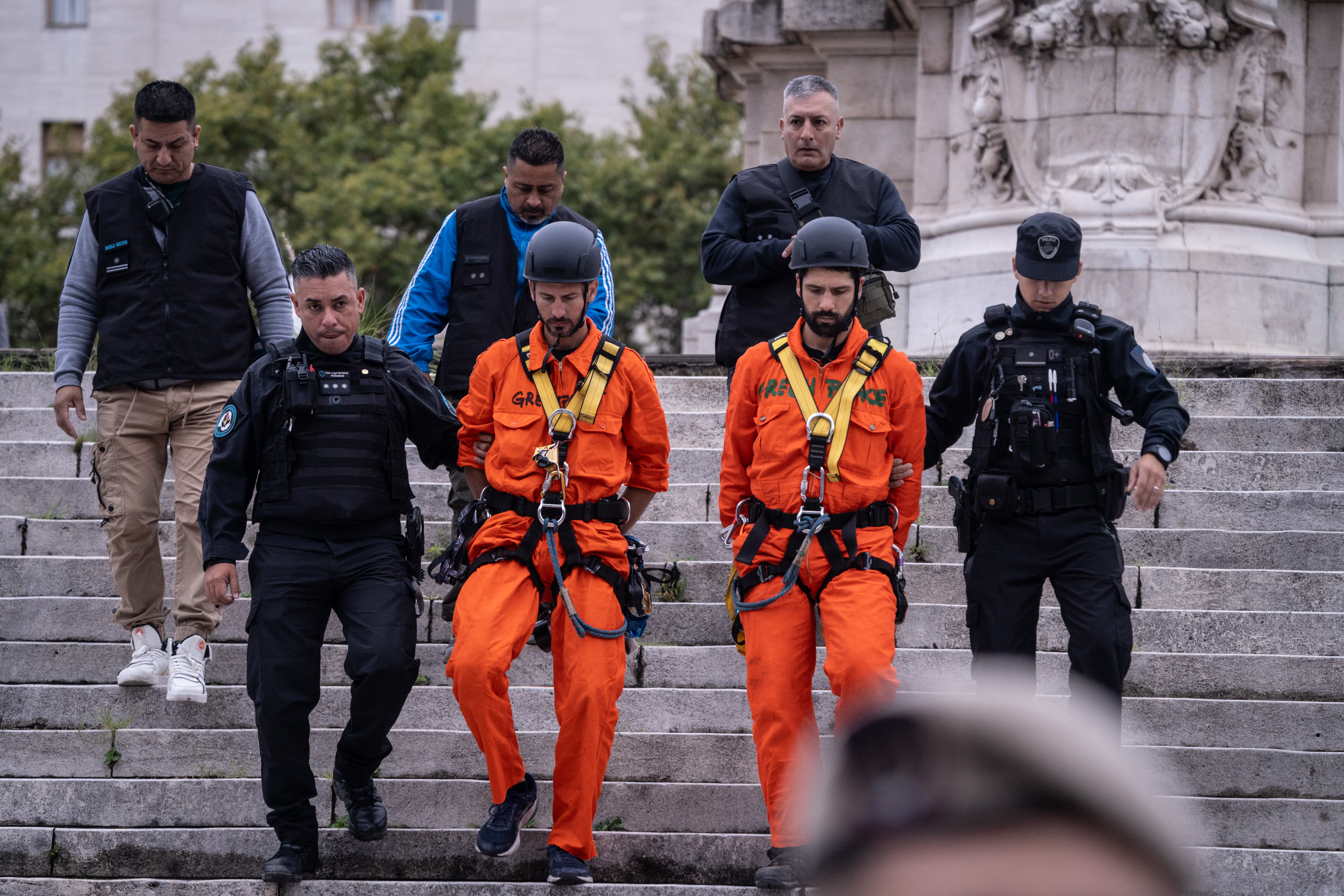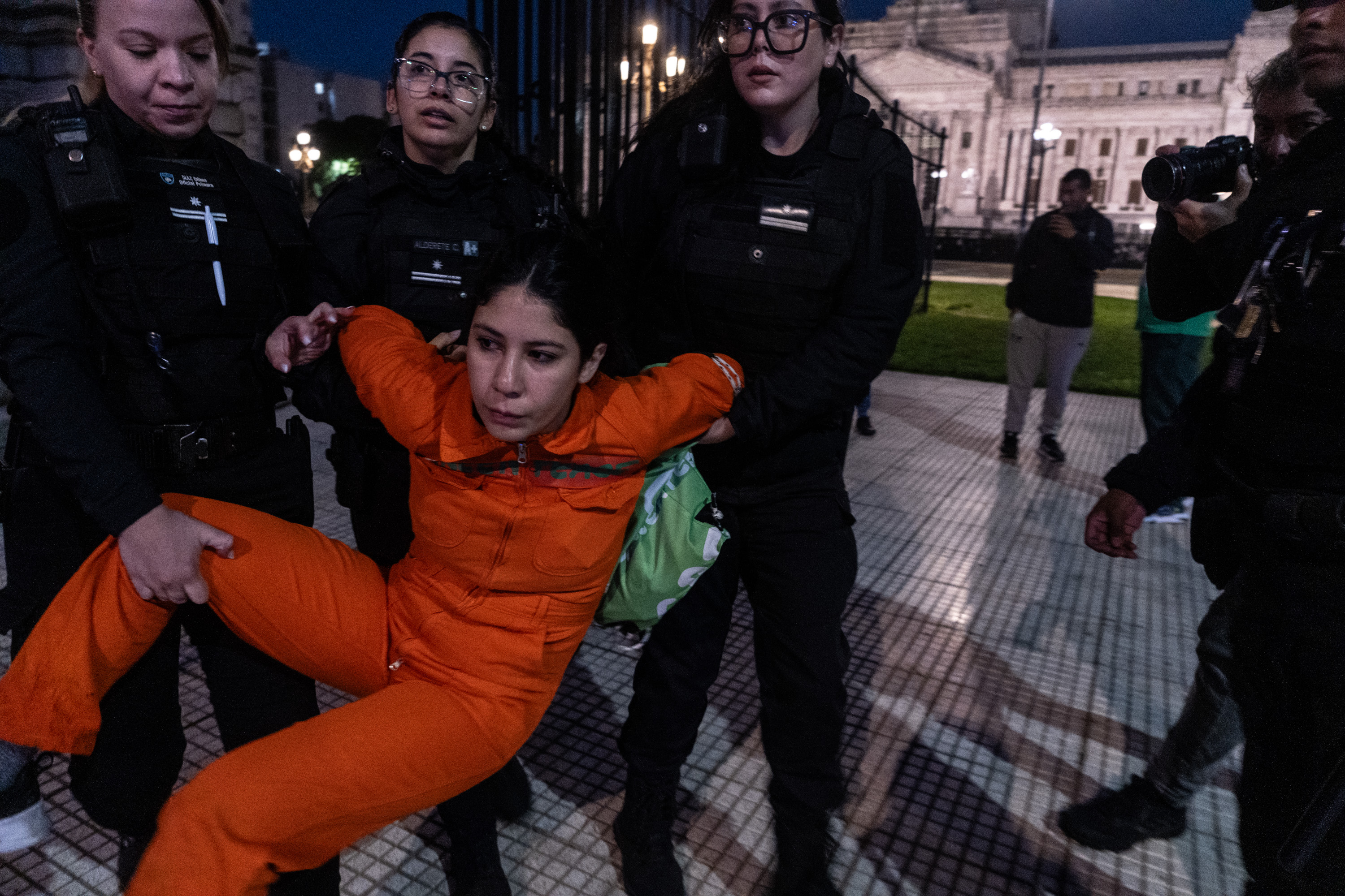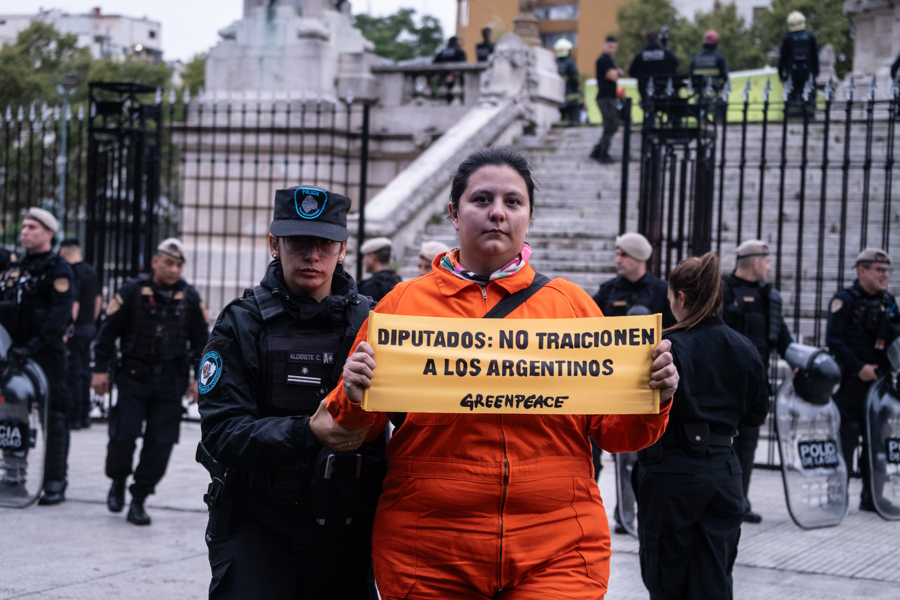 En la antesala del debate en la Cámara de Diputados sobre la modificación de la Ley de Glaciares, activistas de Greenpeace fueron detenidos hoy tras realizar una acción pacífica a metros del Congreso de la Nación para exigir a los legisladores que no avancen con el proyecto de reforma de la Ley que pone en riesgo las principales reservas de agua dulce del país © Sebastián Pani Greenpeace